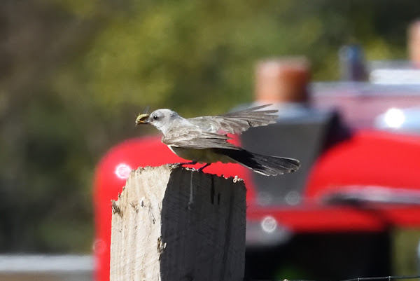 I left there and drove to Green Pond. The Western Kingbird was still there flycatching from the fence around the pond closest to all of the commotion going on with the road construction. I got a few photos of it, including one showing it with a huge insect in its broken bill.