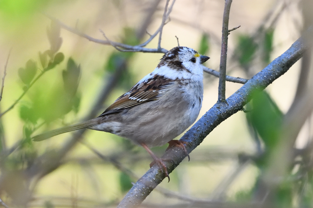 This morning, I parked at the Boulton parking lot and started my usual loop from there. Just before reaching the footbridge, I came across a group of White-throated Sparrows feeding along the path and noted something white in among them. I got on it with binoculars and realized that it was a leucistic White-throated Sparrow! Luckily, I got some photos of it before it disappeared into the brush.